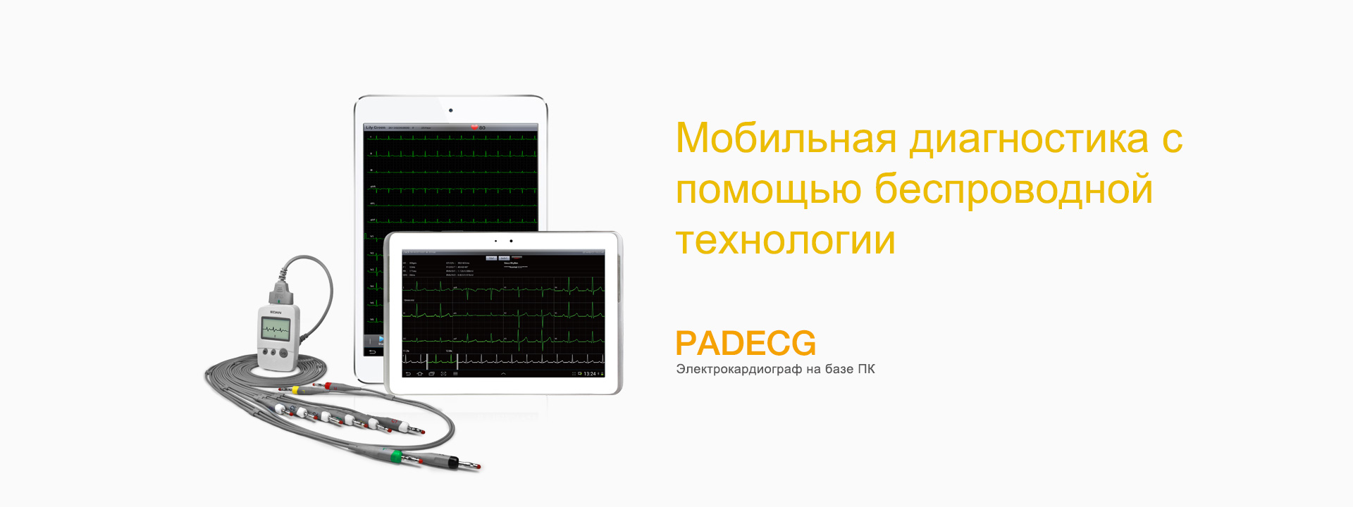 PADECG включает приложение ЭКГ для специалистов и беспроводной модуль регистрации ЭКГ, что позволяет выполнять регистрацию ЭКГ на планшетах с операционной системой Android и iOS.